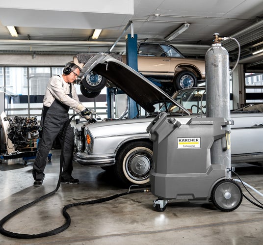 圧縮空気と混合されたドライアイスペレットを超音速で対象物に噴射し、汚れを取り除く清掃機器。汚水を出すことなく、水や溶剤を使わずに強力洗浄します。
