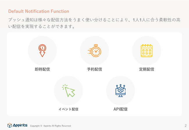 株式会社アピリッツ(本社:東京都渋谷区、代表取締役社長執行役員CEO:和田 順児)は、ECサイトなどWebビジネスで幅広く活用されているプッシュ通知の配信機能の比較を目的とした、ホワイトペーパーを本日公開いたしました。サイトを利用するユーザー1人1人に合わせた効果的なプッシュ通知を配信する上で有効な5つの機能をご紹介しております。ぜひご覧ください。