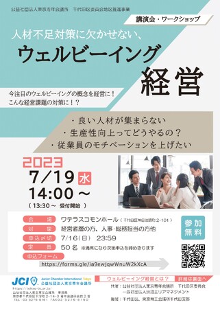 公益社団法人東京青年会議所は、2023年7月19日(水)14時からワテラスコモンホール(東京都千代田区神田淡路町2丁目101番地)にて「人材不足に対策に欠かせない、ウェルブーイング経営」講演会・ワークショップを開催いたします。