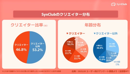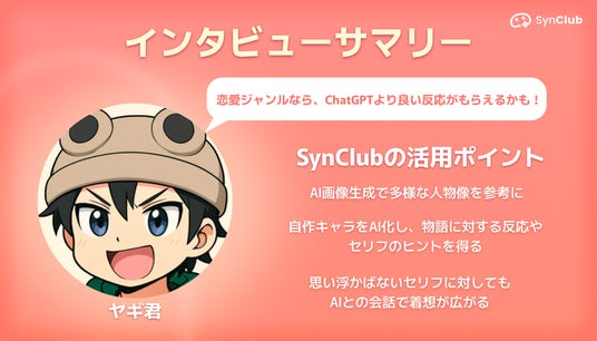 HiClub株式会社(本社:東京都港区、代表取締役社長:古谷由宇)が提供する、 AIチャット&友達作りができる対話型AIアプリ「SynClub」(シンクラブ)(iOS、Android版)は、クリエイター向け機能の開発に向け、現役クリエイターへのインタビューと、アプリ内ユーザーへのアンケートを実施しました。本インタビューでは、クリエイターが生成AIをどのように活用し、創作活動を広げているのかが見えてきました。