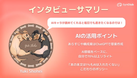Yuki氏は「最終的な作品は自分で書きたい」という強いこだわりを持ち、AI生成コンテンツを直接作品に反映させることには慎重です。一方で、AIからのフィードバック(作品の感想や褒め言葉)によって創作意欲が刺激される可能性があると発言しており、SynClubが「創作のモチベーション向上ツール」として機能する可能性に期待しています。ヤギ君氏も同様に、AIからの肯定的なフィードバックが創作意欲を高めることに同意を示しており、これらのインタビューによって、他のAIツールとは違ったSynClubならではの強みを活かした創作活動の活用の可能性を感じております。