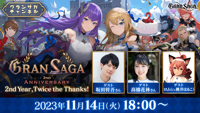 「グランサガ」のリリース2周年を記念し、ファン待望の特番「GRAN 2AGA 2023 ~2nd Year, Twice the Thanks!~」を11月14日(火)18時にグランサガ公式Youtubeにてプレミア配信いたします!