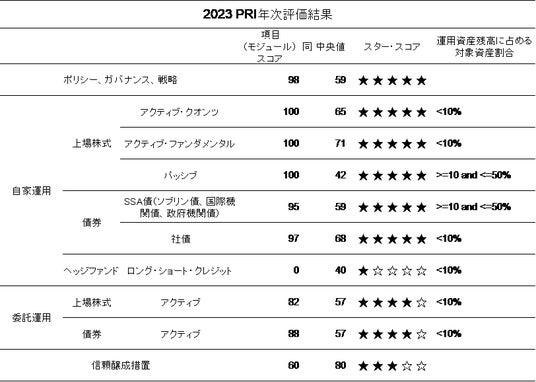 PRI年次評価では、PRI事務局が、各署名機関が提出するレポートを基に、責任投資の実施状況等を対象項目ごとに5段階で評価します。10項目中、8項目で大きく中央値を上回り、全体の方針である「ポリシー、ガバナンス、戦略」のほか、自家運用の上場株式3項目と債券2項目で「5つ星」を獲得しました。
