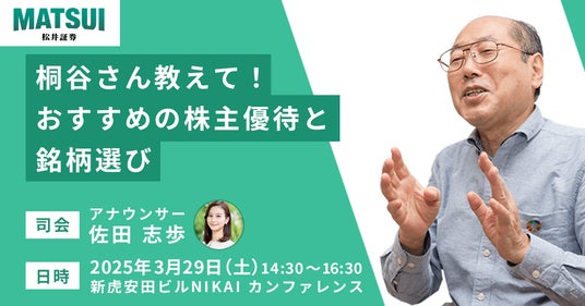 松井証券(本社:東京都千代田区 代表取締役社長:和里田 聰 以下「当社」)は、2025年3月29日(土)に、名古屋証券取引所との共催セミナー「名証市場振興セミナー&特別講演会~桐谷さん教えて!おすすめの株主優待と銘柄選び~」を開催することをお知らせします。