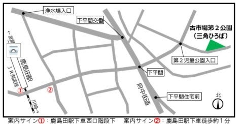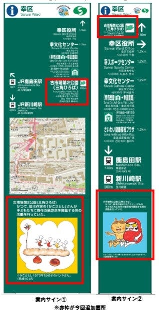 幸区では、「かこさとし」さんゆかりの古市場第2公園をより多くの方に知ってもらい、足を運んでもらうため、鹿島田駅周辺の案内サイン2基を対象に、古市場第2公園(三角ひろば)への案内表示やセツルメントの旗のイラスト、かこさんの代表作である「だるまちゃん」や「からすのパンやさん」シリーズのキャラクターデザインを追加するリニューアルを実施しました。