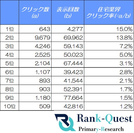 【SEO対策】で検索結果1位(注1)を獲得したランクエスト(https://rank-quest.jp/column/column/how-to-seo/ )は、2025年4月に住宅業界のクライアントサイトを対象とした「検索順位別クリック率(CTR)」の調査を実施しました。