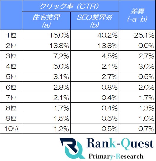 本調査では、検索結果上位10位にランクインした12,145件の住宅関連キーワードを対象に、順位ごとのクリック率の変動を詳細に分析。加えて、ランクエストが運営するSEO業界向けメディア(注2)のクリック率データとも比較し、住宅業界ならではのクリック傾向を浮き彫りにしています。