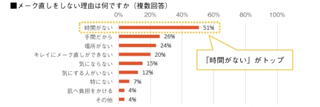 アンケート結果では、93%の方が夏場はメークが崩れやすいと感じているにもかかわらず、メーク直しをする方は56%と、2人に1人しかメーク直しを行っていないという実態がわかりました。メーク直しをしない理由は「時間がない」がトップでした。