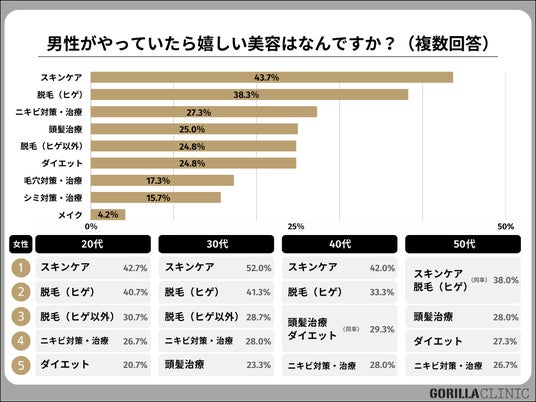 「スキンケア」が最多回答に(43.7%)。年代別では、30代女性の半数が「スキンケア」と回答(52.0%)。次位には「脱毛(ヒゲ)(38.3%)」と、季節問わず目につきやすい部分の美容の回答数が多い結果となりました。