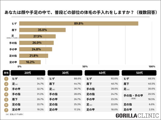 また部位別では、トップ回答に「ヒゲ(89.8%)」、次点に「眉下(35.0%)」がランクイン。季節問わず、他人に見られやすい顔周り部位の毛を気にしている男性が多いことが明らかになりました。