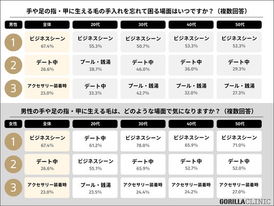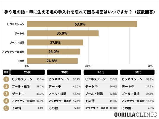 【男性の“ちょっとした毛”が気になる場面】男女ともに「ビジネスシーン」が一位(ゴリラクリニック調べ)