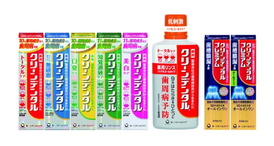 クリーンデンタル トータルケア(販売名:DS薬用歯磨きLb)、同 無研磨a(販売名:DS薬用歯磨きFb)、同 口臭ケア(販売名:DS薬用歯磨きMb)、同 知覚過敏ケア( 販売名:DS薬用歯磨きSb)、同 美白ケア(販売名:DS薬用歯磨きWb)、クリーンデンタル薬用リンス トータルケア ノンアルコールタイプ(販売名:DS薬用リンスNa)、クリーンデンタル プレミアム(販売名:DSデンタルプレミアム1)、同 クールタイプ(販売名:DSデンタルプレミアム2)。いずれも[医薬部外品]