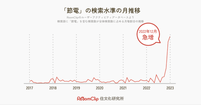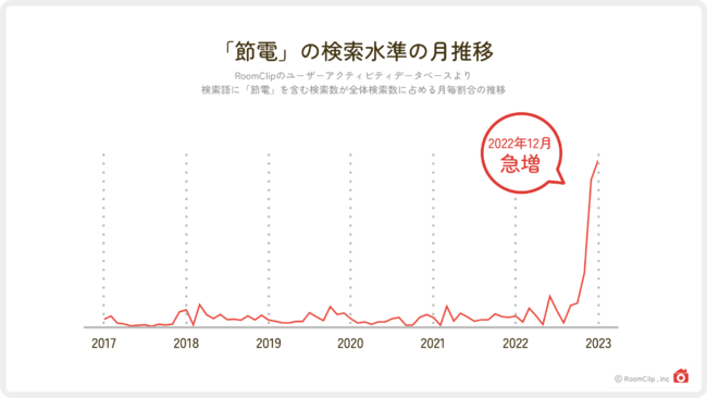 上図はRoomClipにおける「節電」というワードを含むキーワードの検索率の推移です。2022年12月に激増し、2023年1月にはさらに上昇。劇的な推移を見せています。