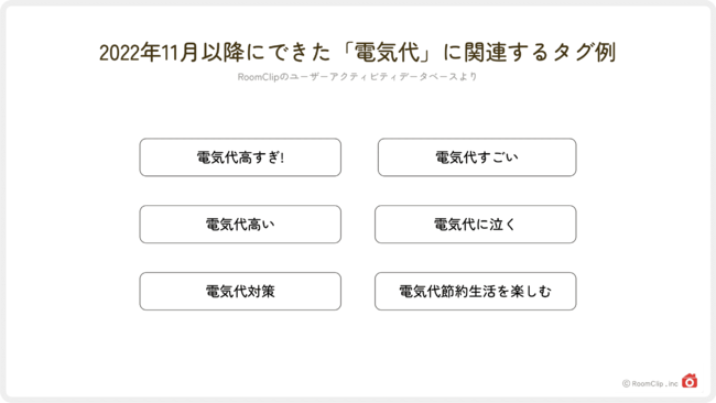 この結果と連動するように「電気代」というキーワードを含むタグの種類も、この3ヶ月で増えています。電気代高騰に対する素直な驚きや悲しみをそのままタグにしたものが目立ちますが、早いタイミングで現象への前向きな姿勢を示すものも生まれていました。