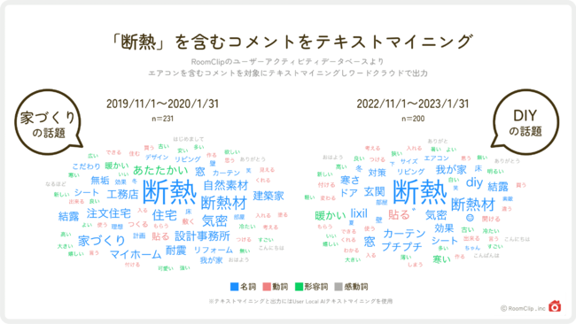2020年以前は主に新築やリフォームに関する話題とともに投稿されることの多かった「断熱」というキーワードが、2022年以降「冷気」「寒さ」や「窓」「カーテン」「DIY」など、寒さ対策に関連する話題として登場することが多くなっています。