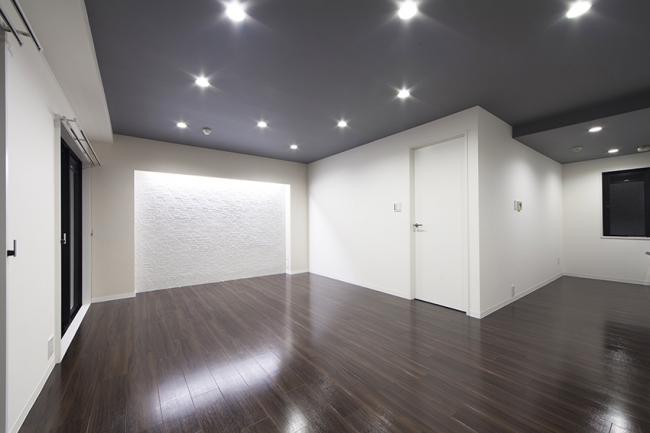 「Renotta」では、一部屋一部屋に独自のコンセプトを設定し、住む人の個性に合うように、「一戸一絵のリノベーション」を行っています。今回、新たに「Renotta」に誕生した「SHADING LIFE」では、壁の一面に光の陰影を楽しむ演出を設けています。凹凸のある壁を間接照明で照らすことで、やわらかな陰影を生み出しています。この壁は職人が手作業で仕上げており、人のあたたかみも感じられます。色使いもシンプルに仕上げているため、心やすらぐ、大人の空間になっています。