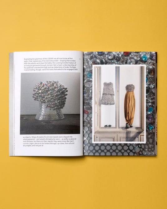 巻頭特集は、2025秋冬メンズ&ウィメンズコレクションにまつわるストーリーです。最初に紹介するのは、パリのオテル・ド・メゾンで行われたプレゼンテーション。ジョナサン・アンダーソンがロエベで手がけた最後のコレクションが、彼の10年間の在任期間を象徴するアートやデザイン作品と対話するかたちで発表されました。また、ジョセフ&アニ・アルバース財団とのコラボレーションによるカプセルコレクションを取り上げながら、ミッドセンチュリーの先駆者である二人が果たした重要な役割――芸術をどのように見るか、何が芸術といえるのかを問い直した――について検討し、その功績にオマージュを捧げています。さらに、アニ・アルバースのテキスタイル タペストリーや、ジョセフ・アルバースの絵画シリーズ《Homage to the Square》が、色鮮やかな手織りのコートやスカート、精緻な刺繍を施したアクセサリーへといかにして落とし込まれたのかを詳しく掘り下げます。