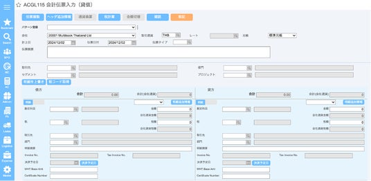 従来は、勘定科目、金額、税、明細摘要のみ、メイン画面で入力が可能で、その他の項目は子画面に遷移し、入力する必要がございましたが、今回、マスター設定により、メイン画面で入力可能な項目を指定可能にしましたので、メイン画面の1画面で、入力を完結することが可能になりました。この設定は、会社毎に可能ですので、部門別管理を行っている会社は部門を表示、行っていない会社は部門を非表示、タイの会社のみ源泉税項目を表示といったカスタマイズが可能です。また、この設定は、会計伝票の照会画面にも反映されますので、伝票を承認する、あるいは、過去の仕訳内容を確認する際の操作性、効率性も改善します。
