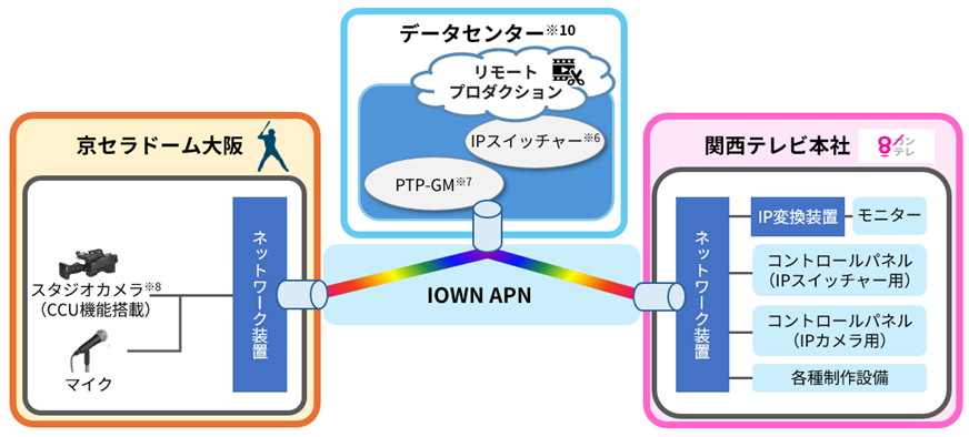 NTT西日本グループ※1は、関西テレビ放送株式会社(以下、関西テレビ)と共同で、2025年9月6日に京セラドーム大阪で開催されたプロ野球公式戦「オリックス・バファローズ 対 北海道日本ハムファイターズ」の地上波放送向け中継において、IOWNオールフォトニクス・ネットワーク(以下、「IOWN APN」)※2※3を活用し、データセンター集約型の制作設備を遠隔操作するリモートプロダクション※4環境を構築・運用しました。