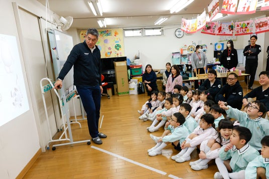 その後、山田代表による「ロボットと楽しむおそうじ授業」を実施。授業では「ロボットとは何か」「ロボットと人との違い」「ロボットによるおそうじとは」などについて、園児にもわかりやすくお話しました。山田代表からの「おそうじするとき、どんなロボットがいたら便利かな?」と問いかけると、園児たちからは「ローラーがついて自動でお掃除をしてくれる」「ゴミ箱にゴミを捨てる手が5本付いているロボット」「頭の上と脇の下に耳が4つ付いているロボット掃除機」といった、個性溢れる声が次々と上がり、目を輝かせながら授業に参加しました。
