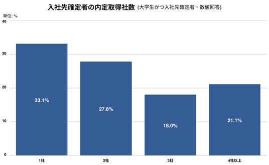 - 入社先確定者のうち、33.1%が1社の内定で入社を確定している
