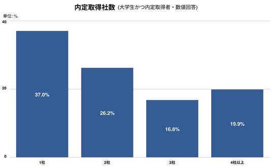 内定取得者の平均内定取得社数は2.4社です。分布を見ると「1社」が37.0%と最多である一方、4社以上も2割程度と、取得社数にばらつきが見られます。