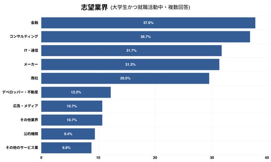 - 就職活動中の大学生の志望業界は金融(37.6%)、コンサル(36.7%)が拮抗して高く、次いでIT通信(31.7%)、メーカー(31.3%)の順