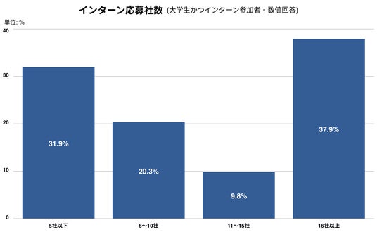 大学生全体のうち、インターンシップへの応募経験がある学生は88.5%(応募平均15.3社)、参加経験がある学生は84.3%(参加平均7.2社)に達しています。分布を見ると、応募社数は16社以上(37.9%)が最多であるのに対し、実際の参加数は5社以下(48.2%)が最多になっています。16社以上と非常に多数のインターンに参加経験がある学生も12.9%存在しています。