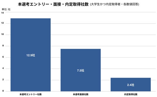 - 内定取得者の本選考エントリー数の平均は12.9社、面接社数は7.5社、内定社数は2.4社