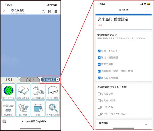 住民の希望に応じた配信だけを届ける「セグメント配信」機能を導入、欲しい配信カテゴリーを「受信設定」に回答することでカスタマイズすることができます。住民がほしい情報に絞って配信ができるため、町からの情報発信がこれまで以上に効果的になることが期待されます。