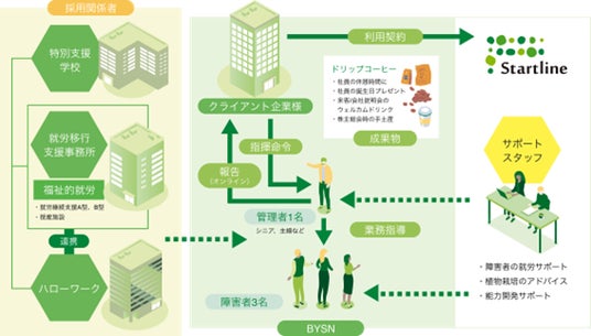 障害者就業支援を通じて“誰もが自分らしく生きる社会”を目指す株式会社スタートライン(本社:東京都三鷹市、代表取締役:西村賢治)は、2024年12月2日(月)、東京都立川市にロースタリー型障害者雇用支援サービスBYSN(バイセン、以下「BYSN」)の4拠点目となる「BYSN TACHIKAWA ROASTERY」を開設します。