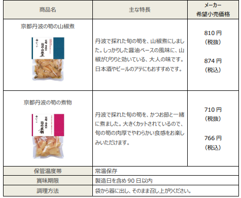 千葉県大多喜や京都府丹波などの名産地をはじめとし、3 エリアの筍を使用した「筍まぜごはんの素」、 京都府丹波の筍をぜいたくに使った「京都丹波の筍の山椒煮」、「京都丹波の筍の煮物」や、大切な方へのギフトとしてもぴったりな「豪華たけのこづくし 5 種セット」などの新セット商品に加えて、多彩なラインアップを ご用意しました。2023 年 4 月下旬※2 よりオンラインストアでの商品のお届けを順次行い、また、全国で の発売をスタートいたします。