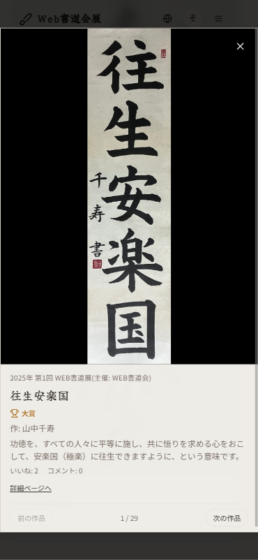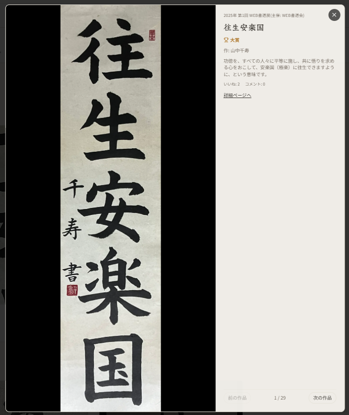 現在1,700名を超えるWeb書道会アプリと、Web書道会展サービスで募集を行い33作品がWeb上に展示され、審査を経て、記念すべき初代グランプリが決定いたしました。