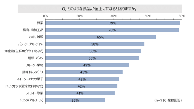 食品の価格高騰を実感している方は94%、お店で値札を見たときに特に実感しています。値上げに対して困っている方は92%、全体的に値上げをされたら困る食品として特に野菜、精肉・肉加工品が挙げられています。いつも購入している食品が値上げしたら躊躇する方は83%、値上げによって買い控える商品が増え、より安い商品に切り替えたとする方が多くいました。