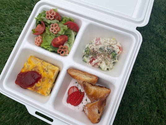 卵を使わずに作ったプラントベースオムレツや、豆乳とかぼちゃ、豆腐で作った“KNOTたまご”を使ったサラダなど4種類のデリを詰め合わせたランチボックスに、OKS CAMPUS内にある桃の花から採取したオリジナルの花酵母を使用して焼き上げたパンをセットにしてご提供します。