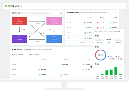 家計簿サービスである「Zaim」の家計データを匿名化し、統計解析することで「どこからどこへ購買の変化があったのか」を明らかにするマーケティングツール。個別商品のほか商品カテゴリ同士の分析や店舗ごとの分析にも対応している。