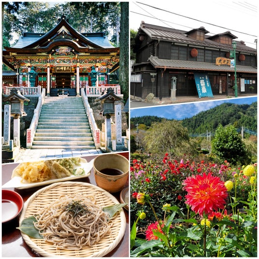 1.山峡の花園と呼ばれる『花の郷ダリア園』関東最大級で350種類5,000株のダリアが咲き乱れます。 2.『観音茶屋』で古式手打ち蕎麦と天婦羅のご昼食。