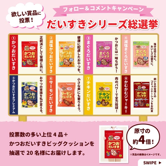 日頃のご愛顧に感謝し、皆様ご自身の手で欲しい商品に投票していただき、選ばれた上位4品を抽選でプレゼントする企画となります。普段おうちのねこちゃん・わんちゃんが食べている商品に投票するも良し、未経験の商品に投票するも良し、だいすきシリーズの人気商品を決めるイベントとしても楽しんでいただければ幸いです。