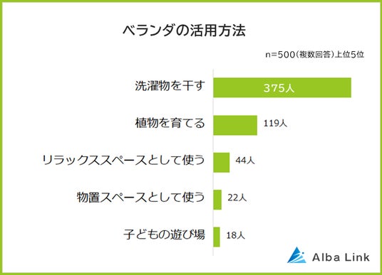 株式会社AlbaLink(本社:東京都江東区、代表取締役:河田 憲二)は、全国の男女500人を対象に「ベランダの悩みに関する意識調査」を実施し、そのデータをランキングにしました。