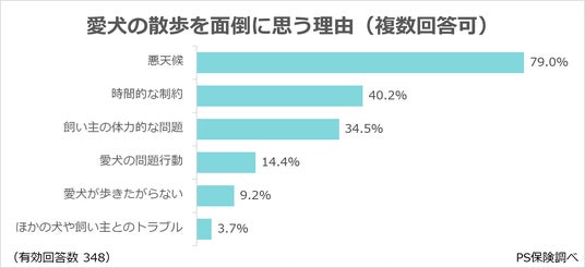 ・愛犬の散歩を面倒に思う理由は、「悪天候」が最多。時間的制約や体力面も影響。