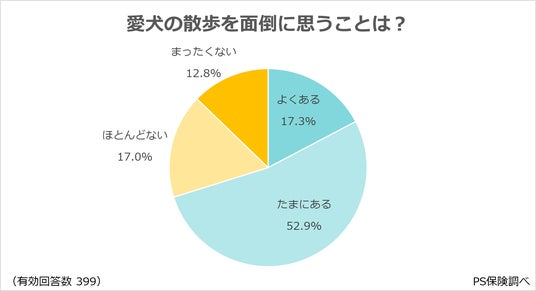 その結果、「たまにある」(52.9%)が最多となりました。次いで、「よくある」(17.3%)が続き、7割の飼い主が、愛犬の散歩を面倒に思うことがあるという回答を得ました。