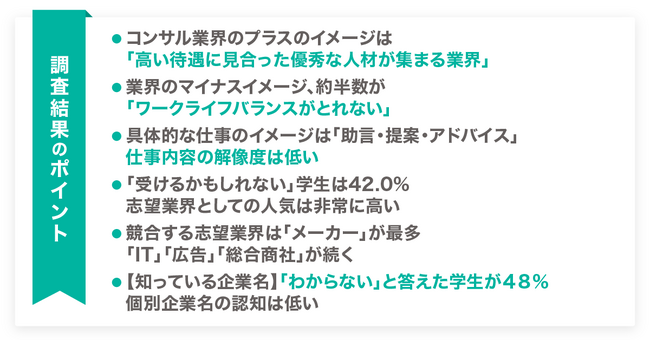 学生が就職活動で企業を選ぶ際は、まずは業界研究によって業界を絞り込むケースが多く見られます。つまり、新卒採用において、業界イメージは非常に重要です。「花形」のイメージがあり、学生人気も高いコンサル業界。しかし実際には、具体的な仕事内容や企業名はあまり知られておらず、まだまだ伸びしろがあると言えます。コンサル業界に対する学生の理解を深めていくことで、質の高い母集団形成にもつながるでしょう。