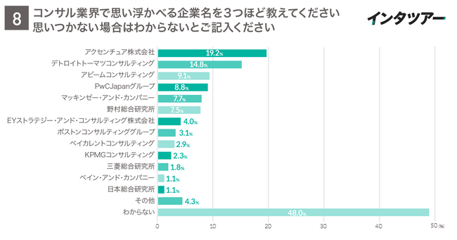 1位は「アクセンチュア株式会社」で19.2%、2位は「デロイトトーマツコンサルティング合同会社」で14.8%と、他の企業よりも特に認知度が高いことがわかります。 他にも大手コンサルティングファームの「アビームコンサルティング」「PwC」「マッキンゼー」「野村総研」などの名前が上がりました。 一方で、具体的な企業名が「わからない」と答えた学生は48.0%で半数近くとなりました。設問6でコンサル業界を「受ける」「受けるかもしれない」と答え学生が42%に上った一方で、具体的な会社名がわからない学生も約半数に上る結果は、業界のイメージが先行しており具体的な会社の認知は低いことが伺えます。
