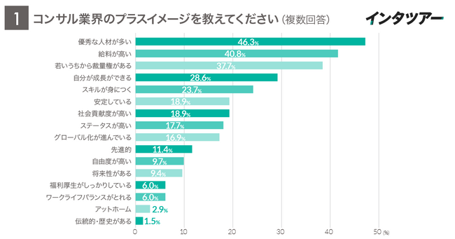 設問1では、コンサル業界の良いイメージについて複数回答で聞きました。