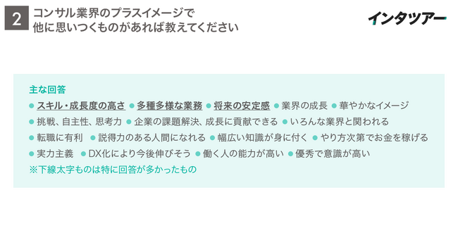設問2. コンサル業界のプラスイメージで他に思いつくものがあれば教えてください(自由記述)