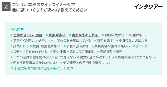 設問4. コンサル業界のマイナスイメージで他に思いつくものがあれば教えてください(自由記述)