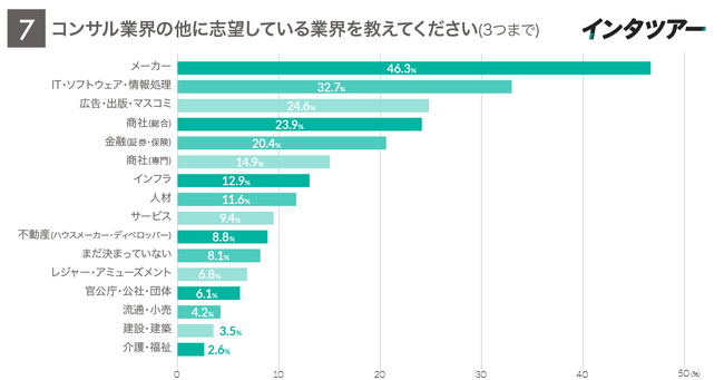 設問7では、設問6でコンサル業界を「受ける」「受けるかも」と回答し学生に、そのほかに志望している業界を聞きました。