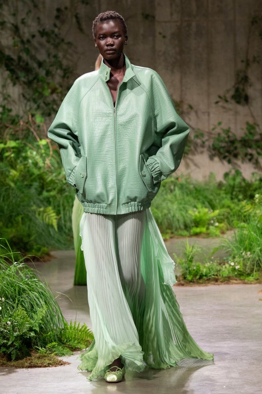 ファッションショーで発表された、テクニカルギャバジンで隙のない端正なフォルムに仕立てられたショートコートには、カモミールの花のモチーフが飾られ、柔らかな印象をもたらします。