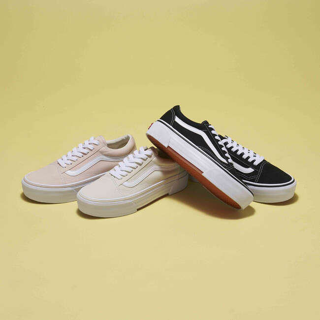 VANSのクラシックラインのアイコンモデル・OLD SKOOL(オールドスクール)、SLIP-ON(スリッポン)をベースに、過去に登場していた厚底のPLATFORM SOLEをアップデート。 TOE GUARDとHEEL GUARDの間から覗くアウトソールラバーがアクセントのCHUNKY SOLEを使用したコレクションです。