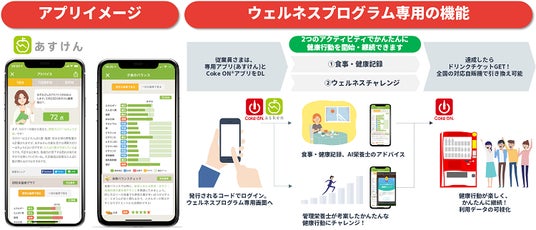「ウェルネスプログラム」は、コカ・コーラ社の自動販売機を設置した企業が費用無料で導入できる、ヘルスケアアプリ「あすけん」とコカ・コーラ公式アプリ「Coke ON(R)」*² のドリンクチケットを利用した、お得意さまの健康経営に向けた取り組みをサポートするプログラムです。